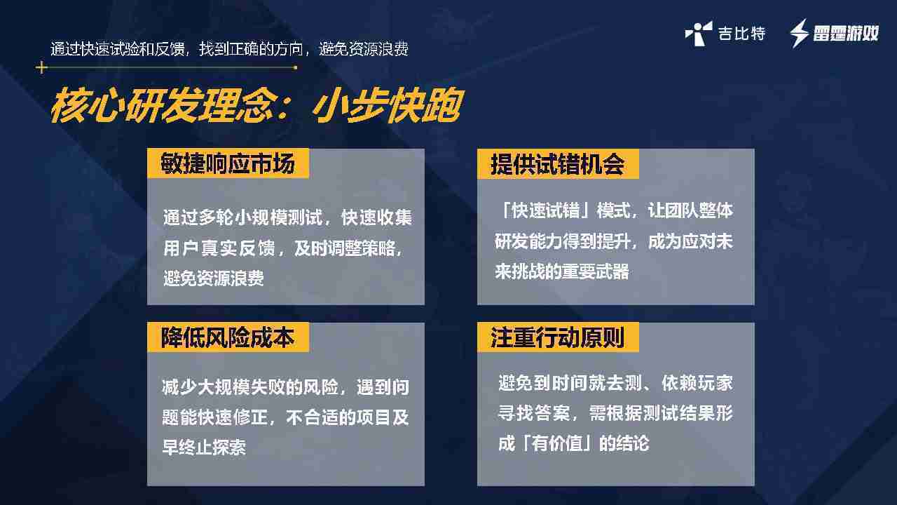 小步快跑不是找答案,,而是验证答案。。我们之前有项目是这样的,,有些制作人会有几个方向觉得都可以做,,,但是不确定做哪一个,,,,会选择几个都做,,做完拿到市场跑,,跑出哪一个更好,,基于这个再做后续的研发和拓展。。但这种情况最容易出现一个问题,,,,可能被玩家裹胁,,玩家说这个点不错、、、那个点不错,,,,到底听还是不听,,,,不听感觉是无视玩家的反馈,,,听的话,,可能自己没想清楚导致研发思路发生偏颇。。所以针对这一点后面自己复盘整理,,,,发现制作人自己心里要有数,,,,要做自己觉得好玩的,,,而且明确知道这个东西是你想做的,,,然后拿到市场验证这个答案是不是对的,,而不是拿一堆答案找哪一个答案更好。。